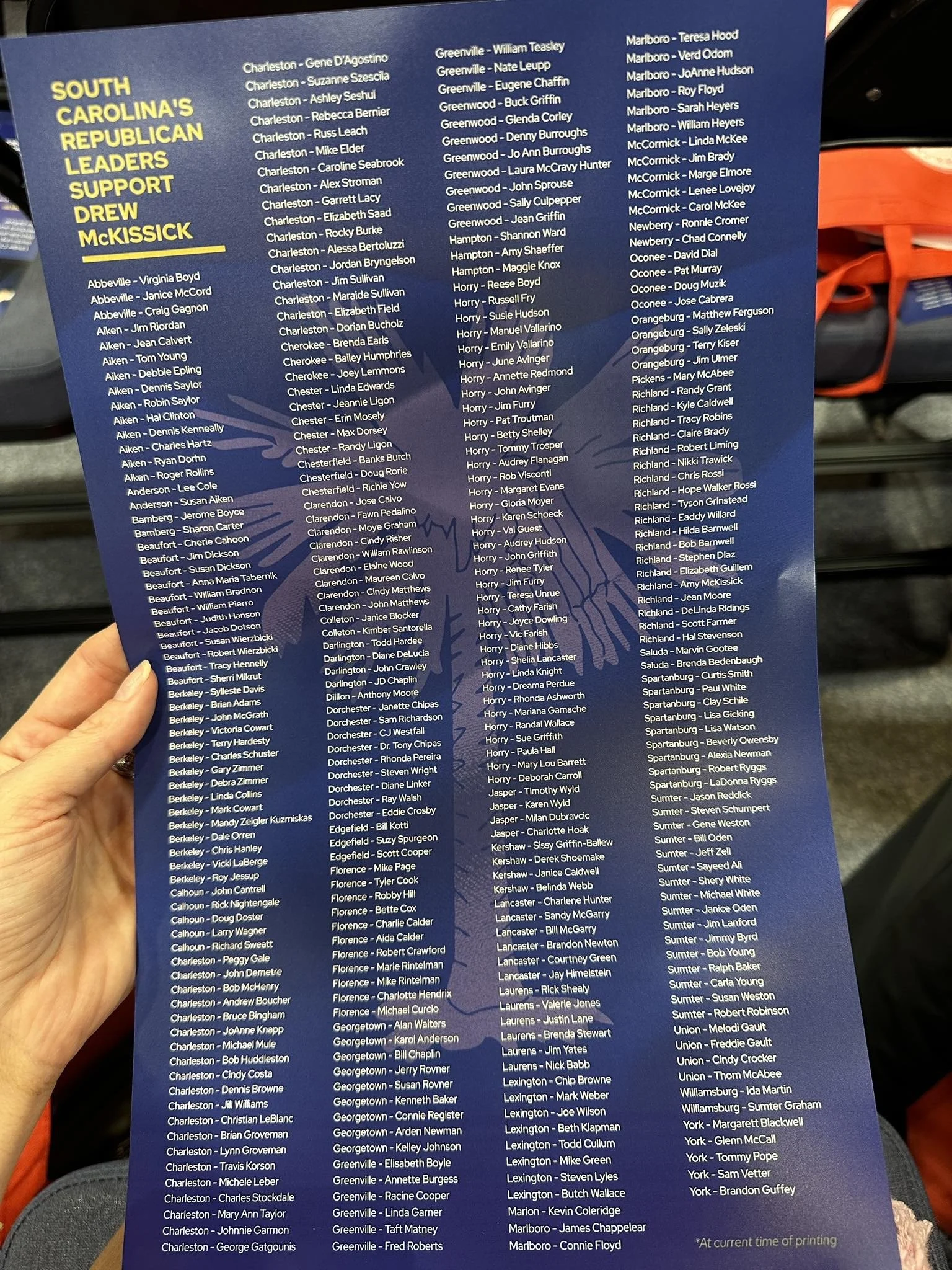 And yet today, sitting on each seat when we arrived at the State Convention was an entire list entitled “South Carolina’s Republican Leaders Support Drew McKissick.”