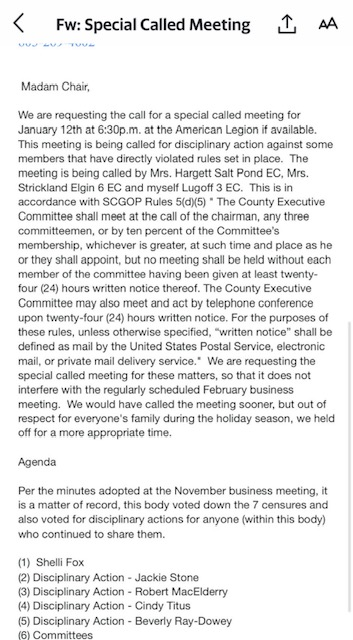 During the Jan 12 special called meeting by allies of Chairwoman Dunlap, SC Confidential was initially told by Dunlap to exit the meeting. We asked for documentation and the reasons why we were not allowed to attend. Dunlap exited the building for approximately 30 minutes and started the meeting late. SC Confidential and other guests were allowed to stay without addressing the situation further.