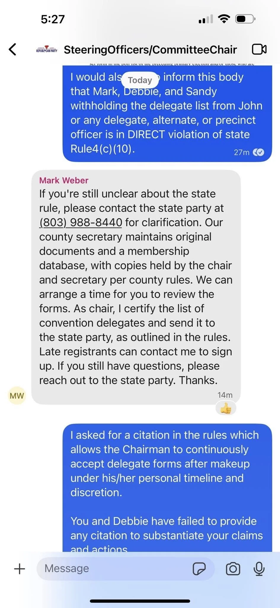 In this statement Mark Weber claims that continuing to accept P1 delegate forms under his personal timeline and discretion is permitted “per our state rule.”