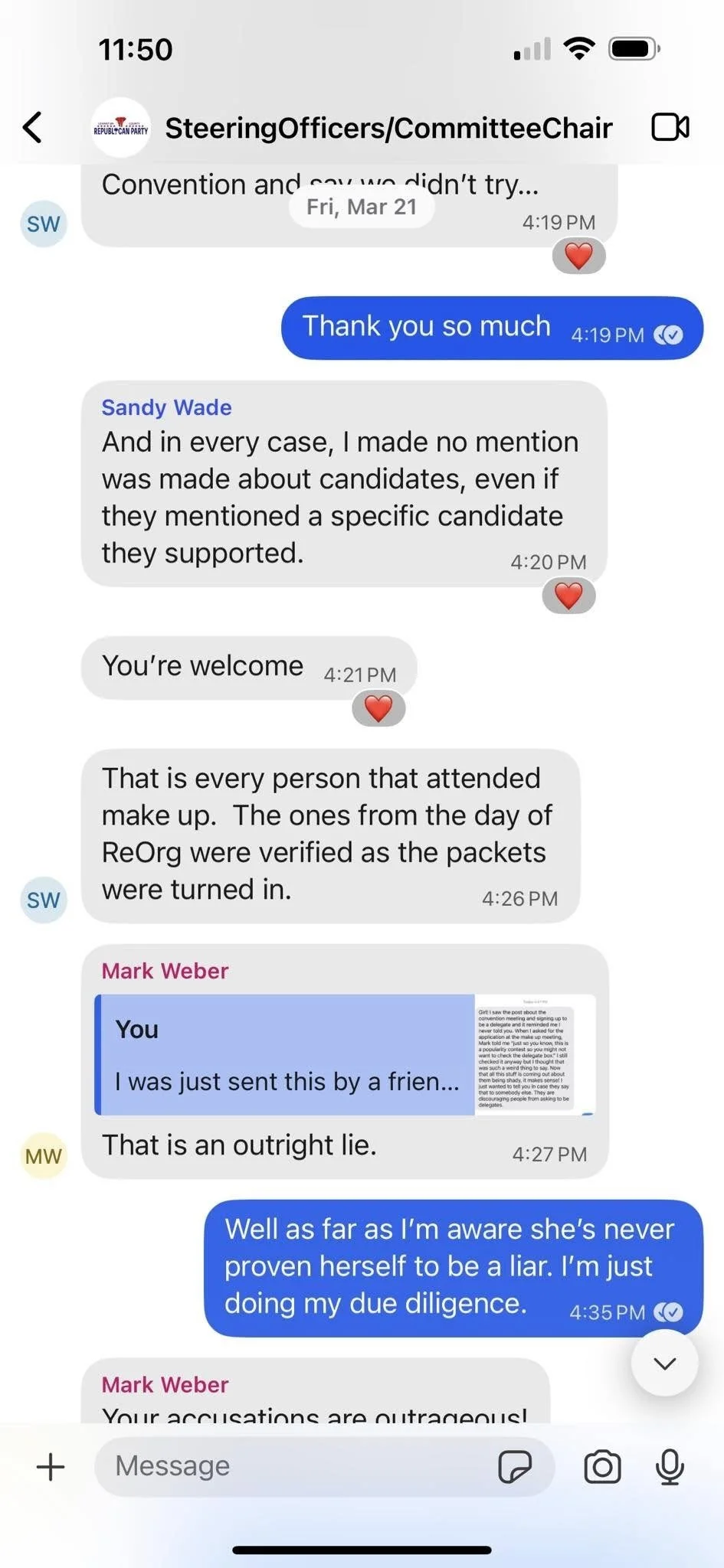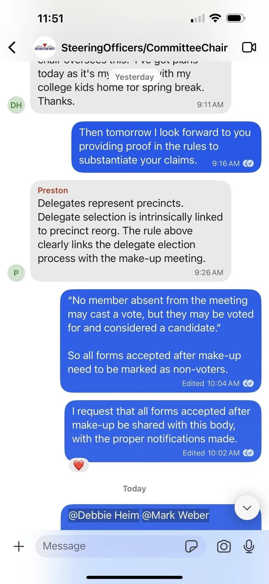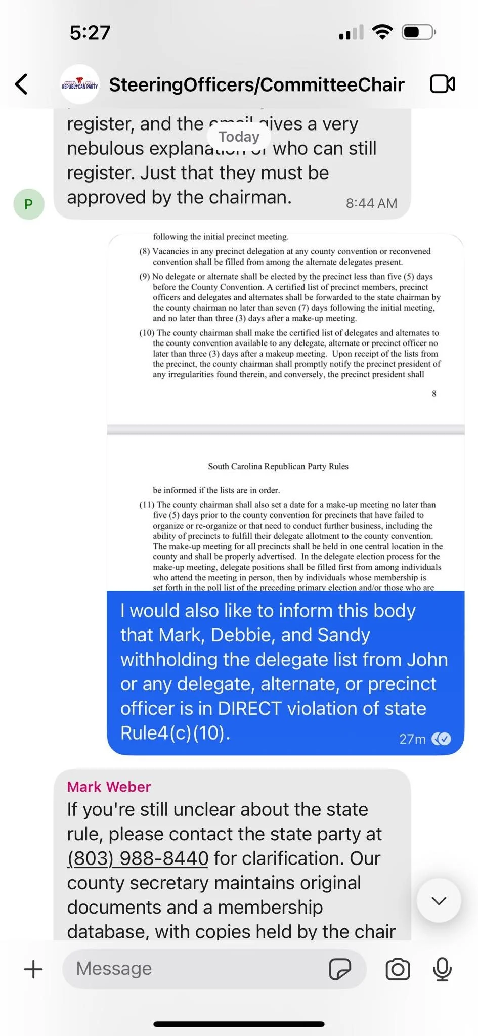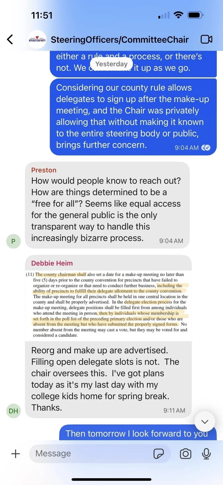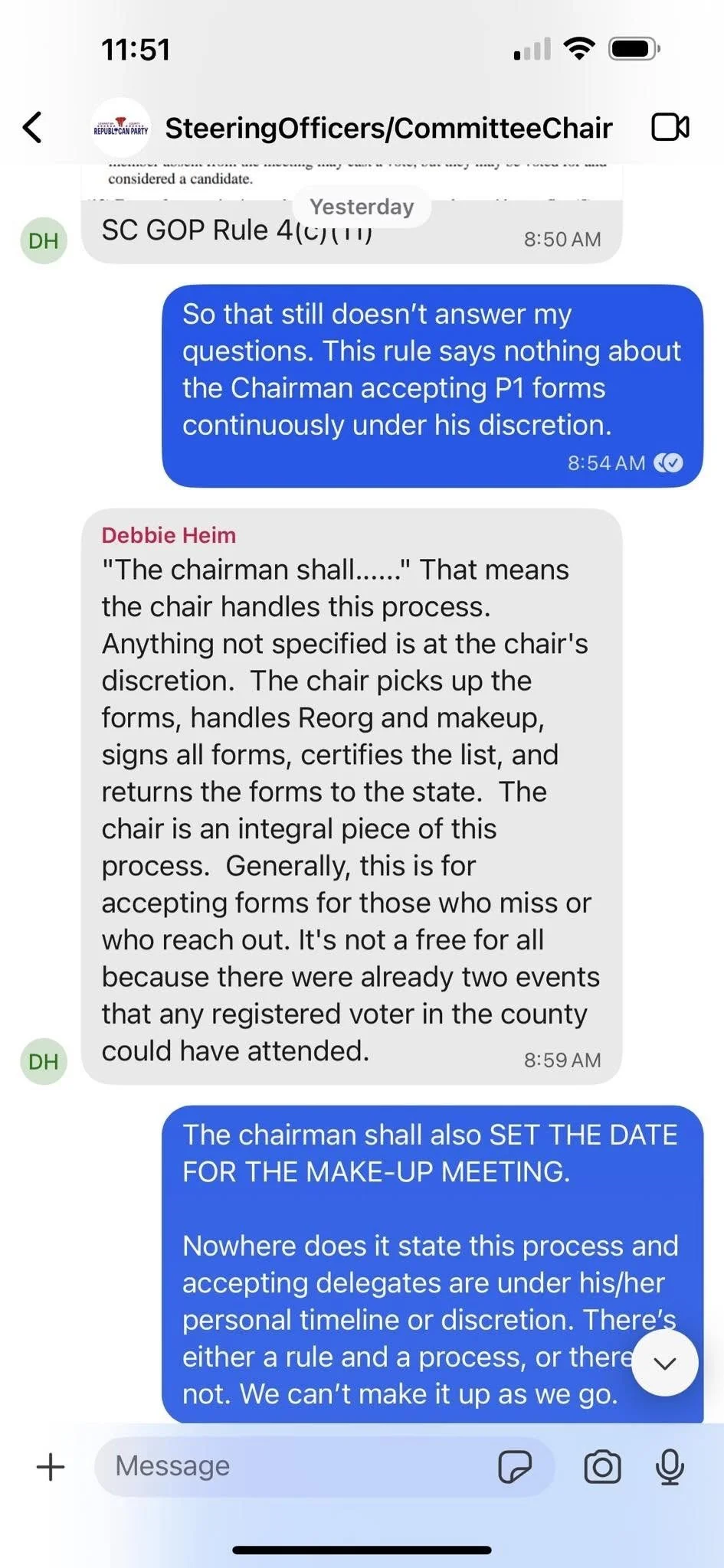 On 3/22 Debbie Heim responded by citing the state rules. Again, nowhere in her citation does the state rule confirm that accepting delegates is under the Chair’s discretion and charge. I have asked twice for further clarity and citation to a state or county rule which allows this. Non have been provided.