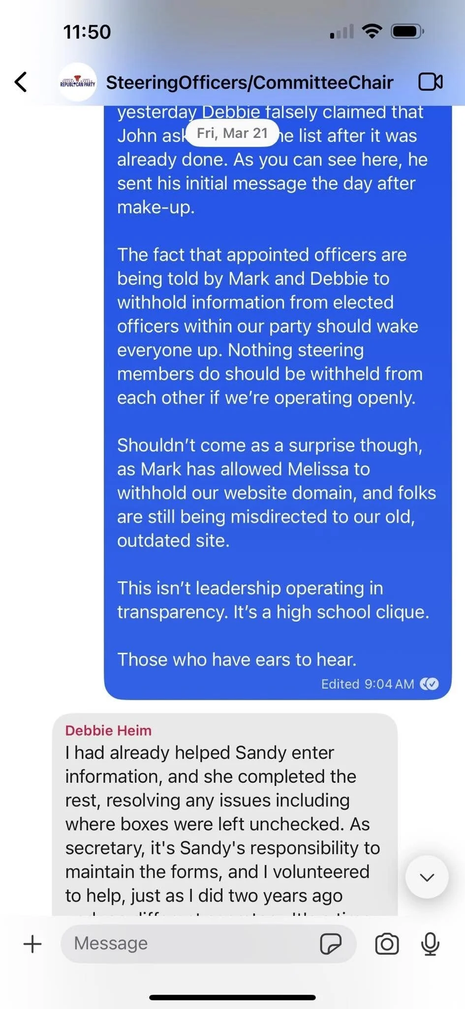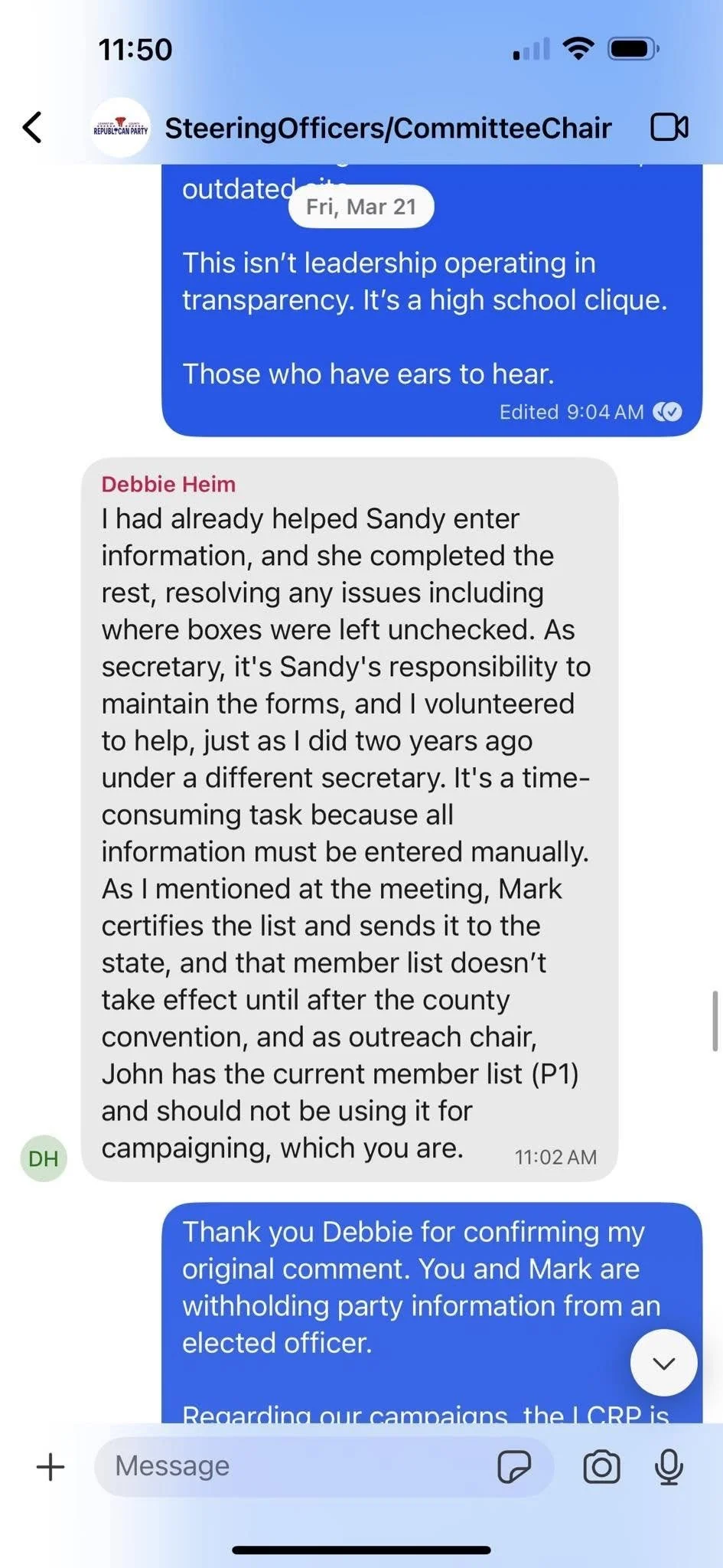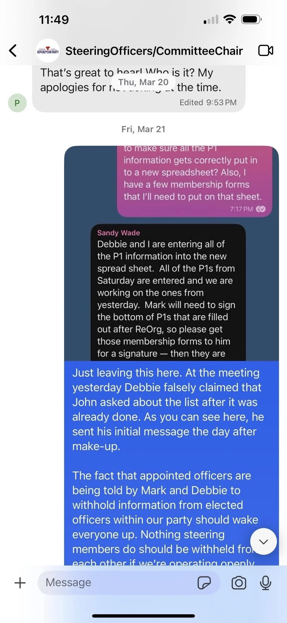 We had already made this clear, and yet Mark and Debbie continue to use their false accusation to justify withholding pertinent party information from a duly elected officer.