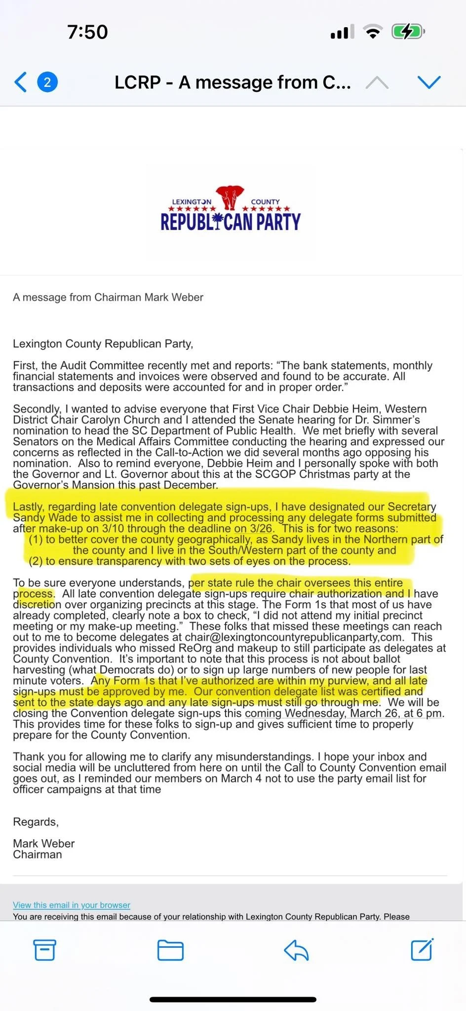 Below is a statement sent by the Lexington County Republican Party Chairman Mark Weber today, March 23, at 12:17am.