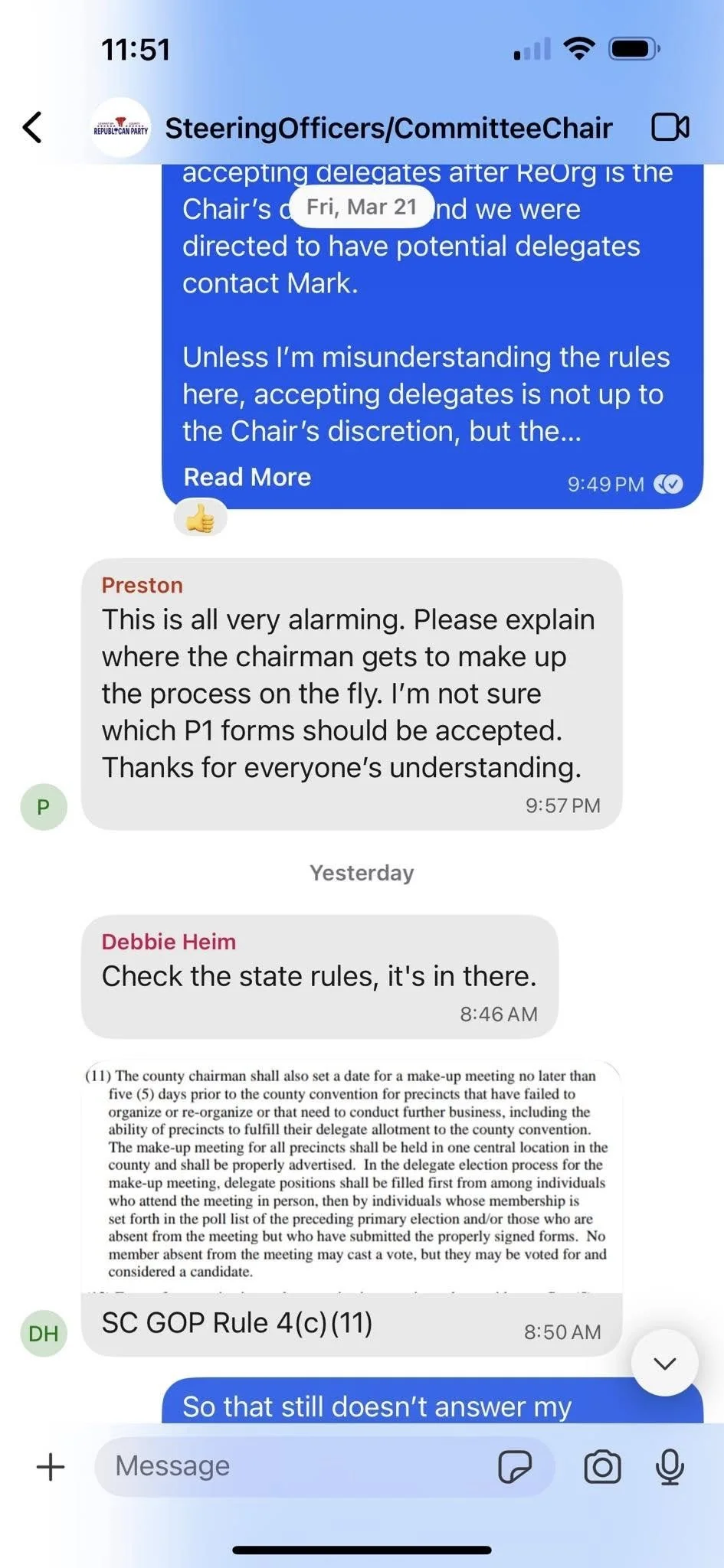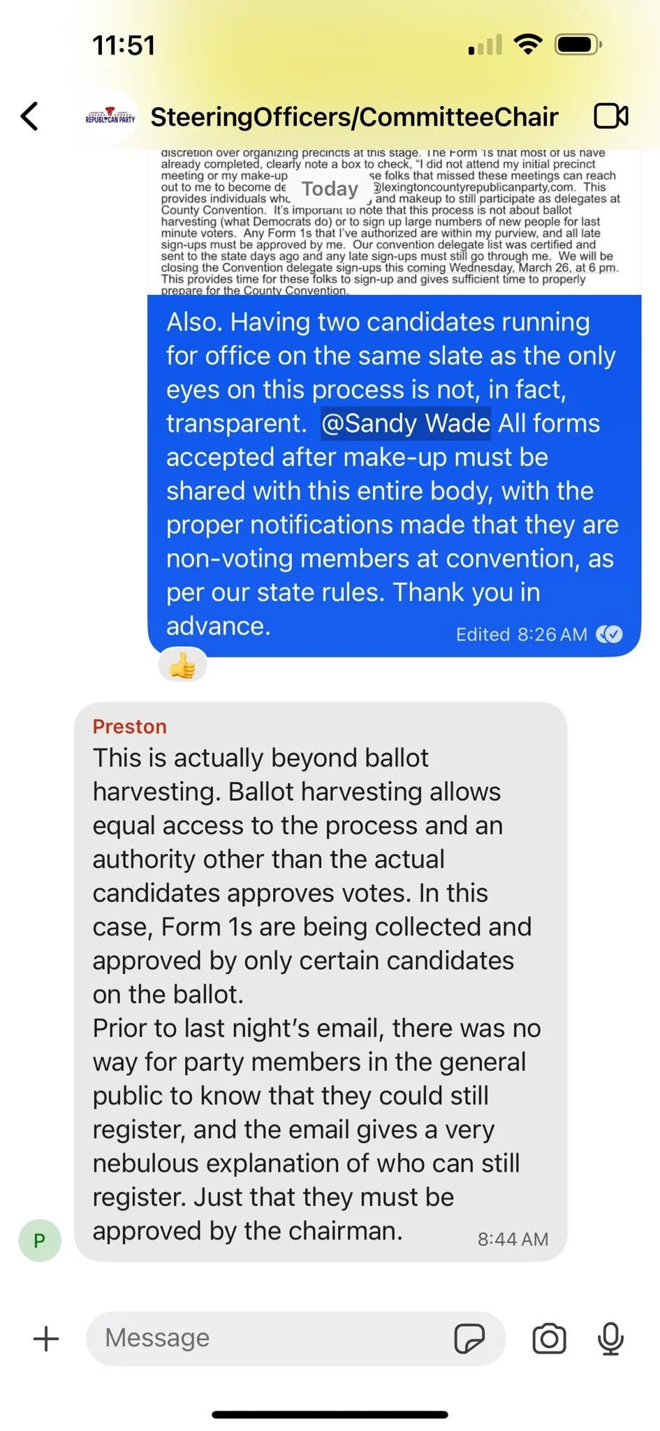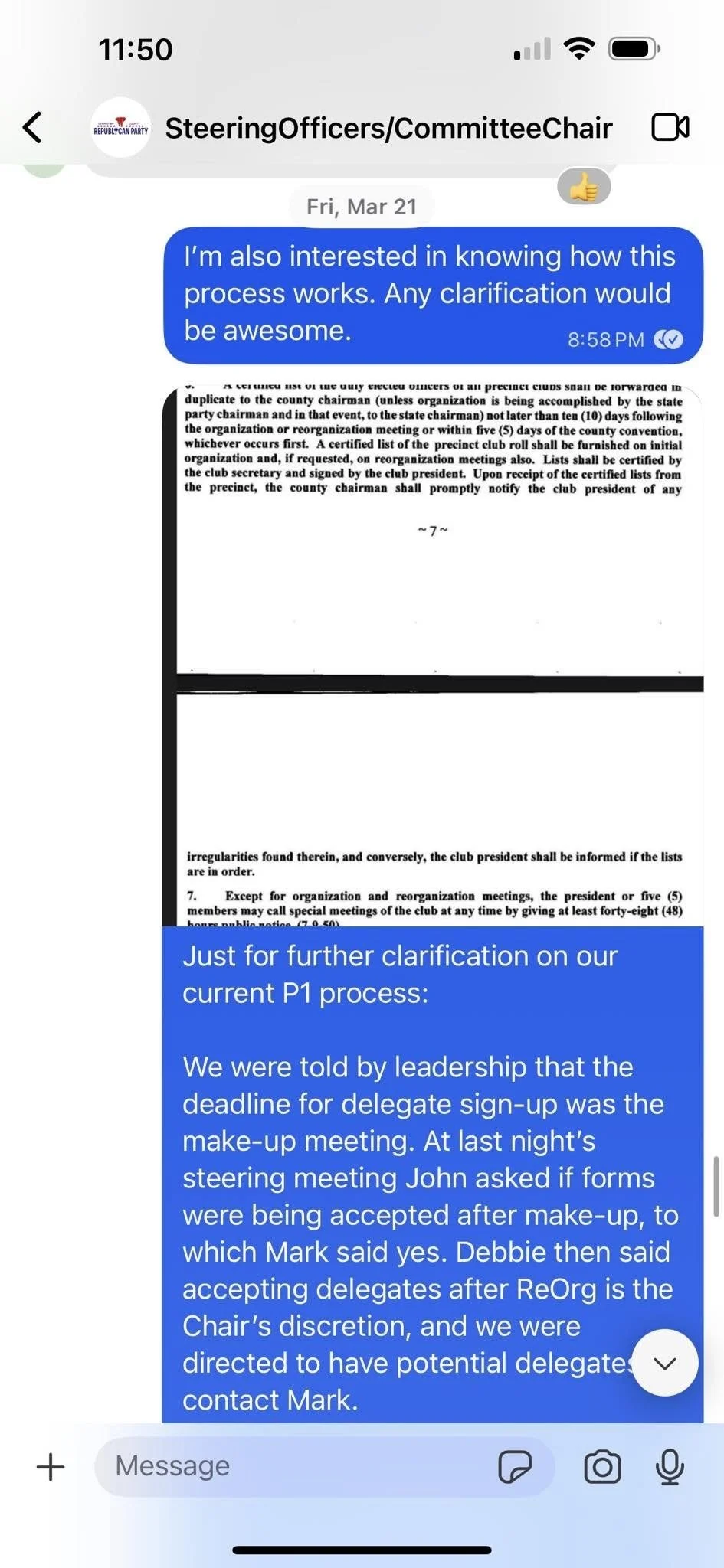 On 3/21 the day after our steering meeting, I read our county rules regarding this matter, and nowhere could I find the the rules state that forms can be accepted under the Chair’s discretion. I took a screenshot and messaged our steering chat asking for more clarification.