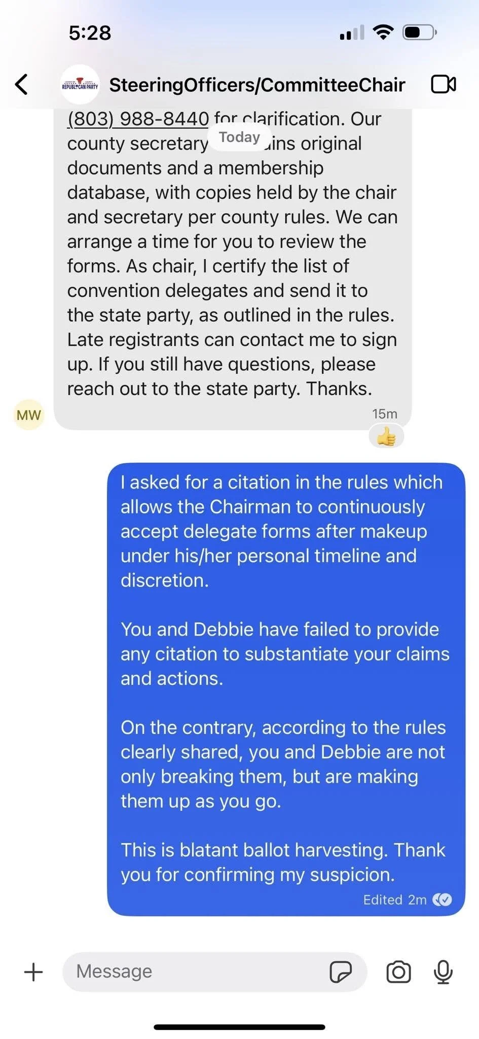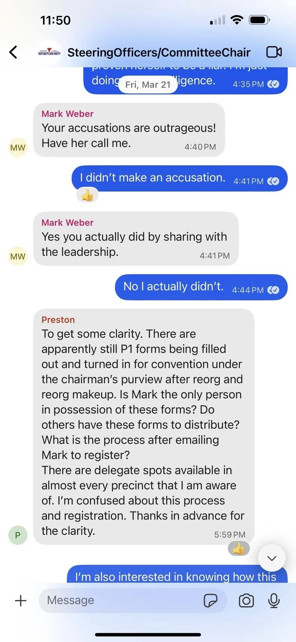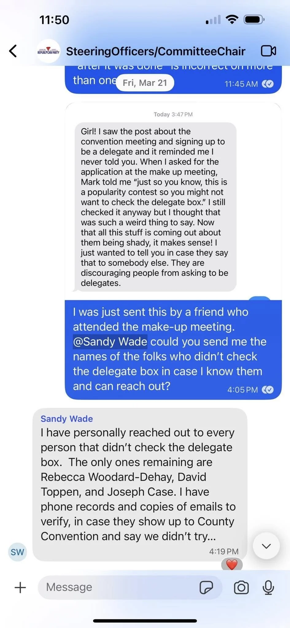 On 3/21 the day after our steering meeting, I read our county rules regarding this matter, and nowhere could I find the the rules state that forms can be accepted under the Chair’s discretion. I took a screenshot and messaged our steering chat asking for more clarification.