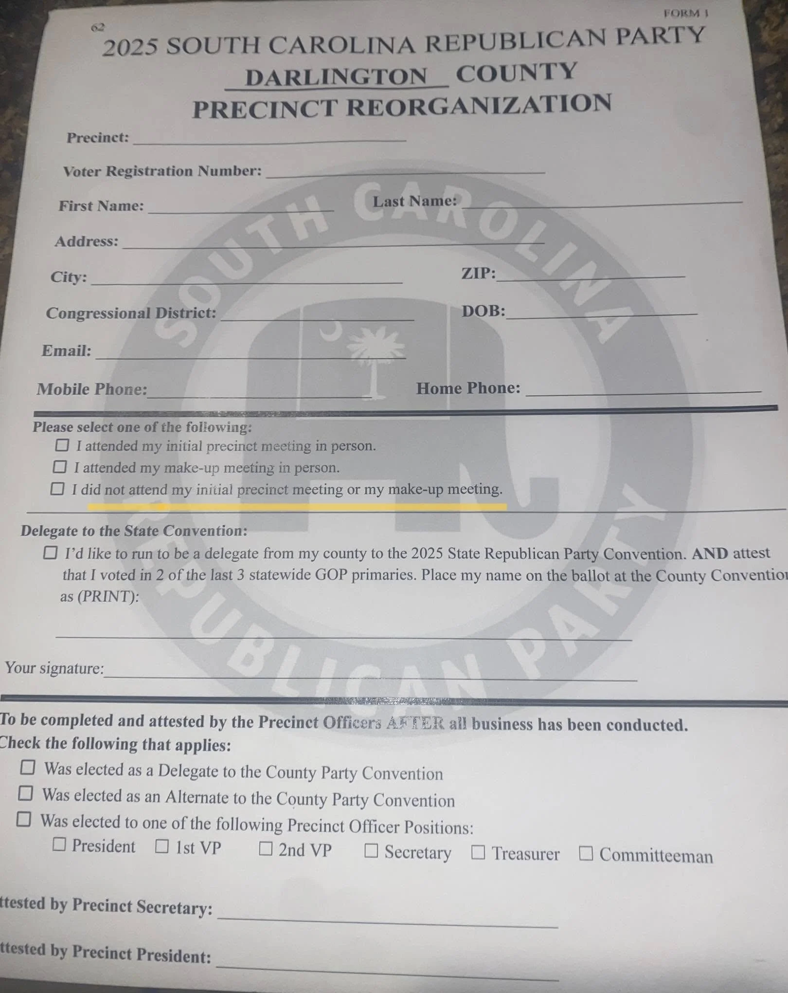 As you will see in the 2025 Precinct ReOrganization Form, the language has been changed to read: I did not attend my initial precinct meeting or my make-up meeting. This new language is in violation to SCGOP Rules 4-c-11. Eliminate “elected” - in violation to Party Rules - and now they can add anyone they want as a Delegate.
