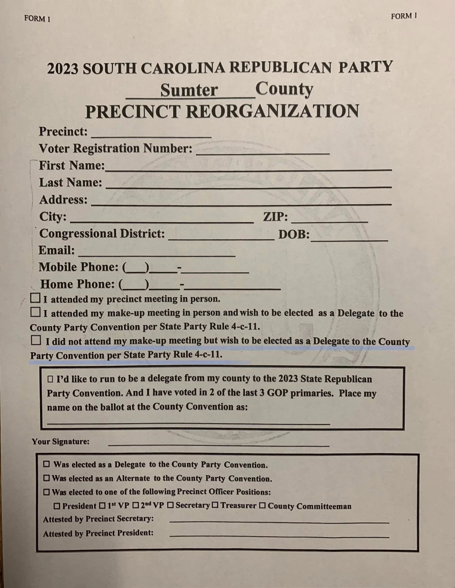 In 2023, the Precinct ReOrganization Form 1, please see highlighted sentence beside the third box. It reads: I did not attend my make-up meeting but wish to be elected as a Delegate to the County Party Convention per State Party Rule 4-c-11.